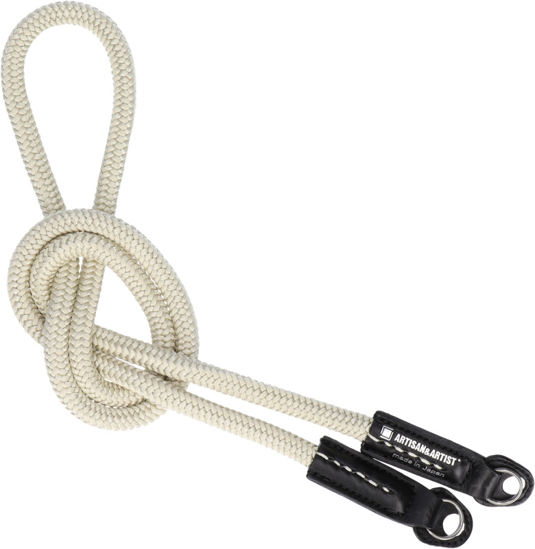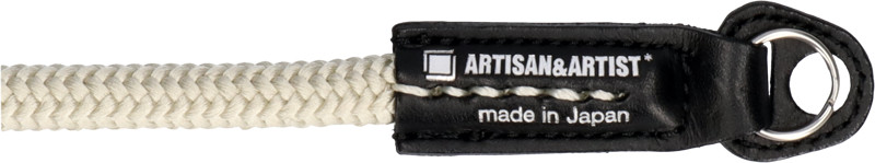 Popruh je vyroben technikou Kumi-himo, která zahrnuje speciální dvojitou strukturu vetkanou na vnější vrstvě osminásobné šňůry, která zajišťuje správnou míru pružnosti, pevnosti a pohodlí na kůži. Pružnost pružné hedvábné šňůry umožňuje různé styly snímání, například omotání kolem ruky nebo úpravu délky vázáním uzlů. Bílá ručně prošitá výztuha uprostřed kožené oblasti uchycení je ikonickým designovým prvkem naší značky.