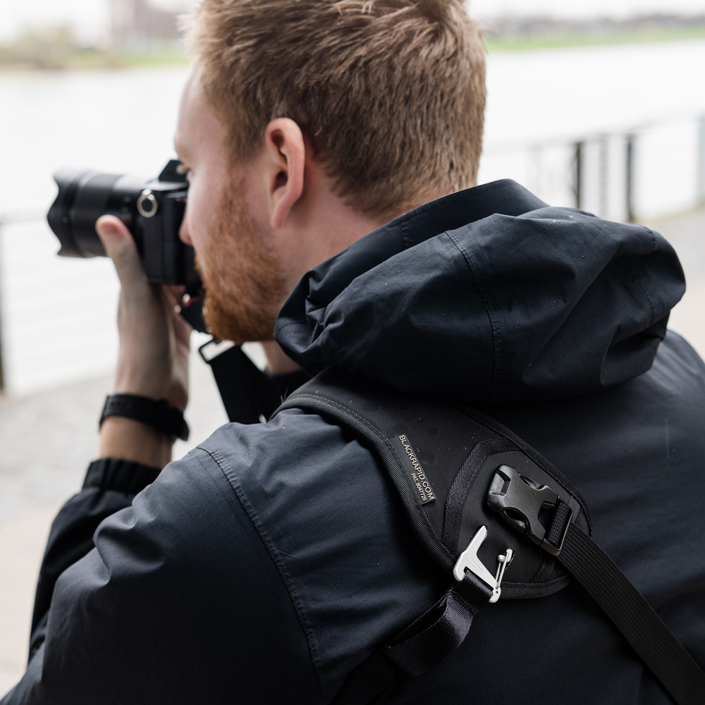 The BlackRapid Curve Breathe is designed for the right handed photographer and hangs from over the left shoulder to the right hip. The carry strap has a wide curved shoulder pad that allows it to adapt ergonomically to the female body. An extra large shaped shoulder pad provides far reaching carrying comfort, making this carry strap suitable for both the adventurous and the sports photographer.