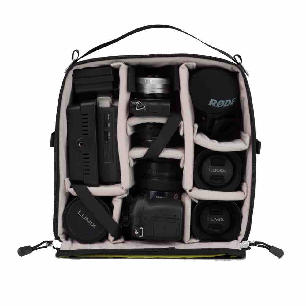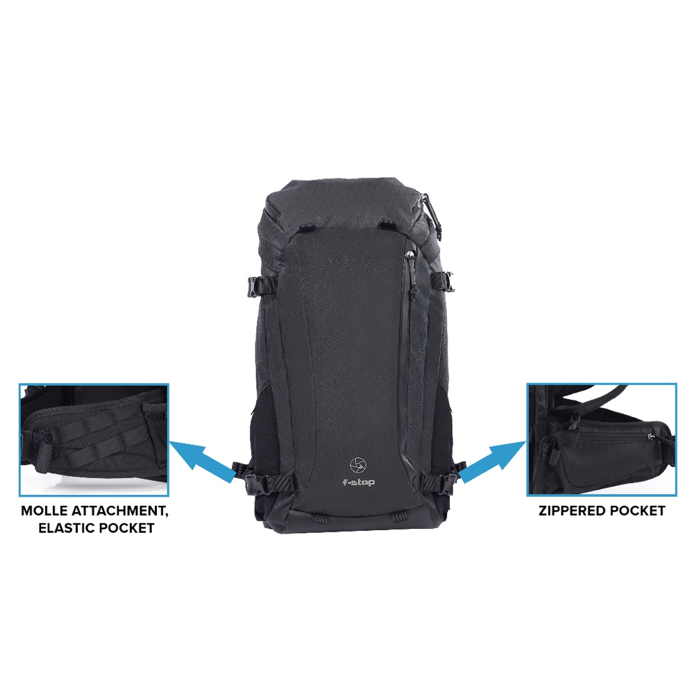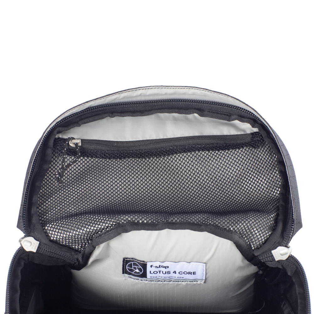 For the Lotus 4 Core backpack, the F stop Shallow Medium insert is included. The backpack also has many storage options making it suitable for any photographer. On the outside is a vertical zipped storage compartment and padded sleeve for devices. It features double sided zipped storage pockets on the top member. On the hip belt there is a zipped storage compartment and it features integrated MOLLE web. On the outside, there are elastic mesh pockets on both sides for a water bottle or a tripod.,