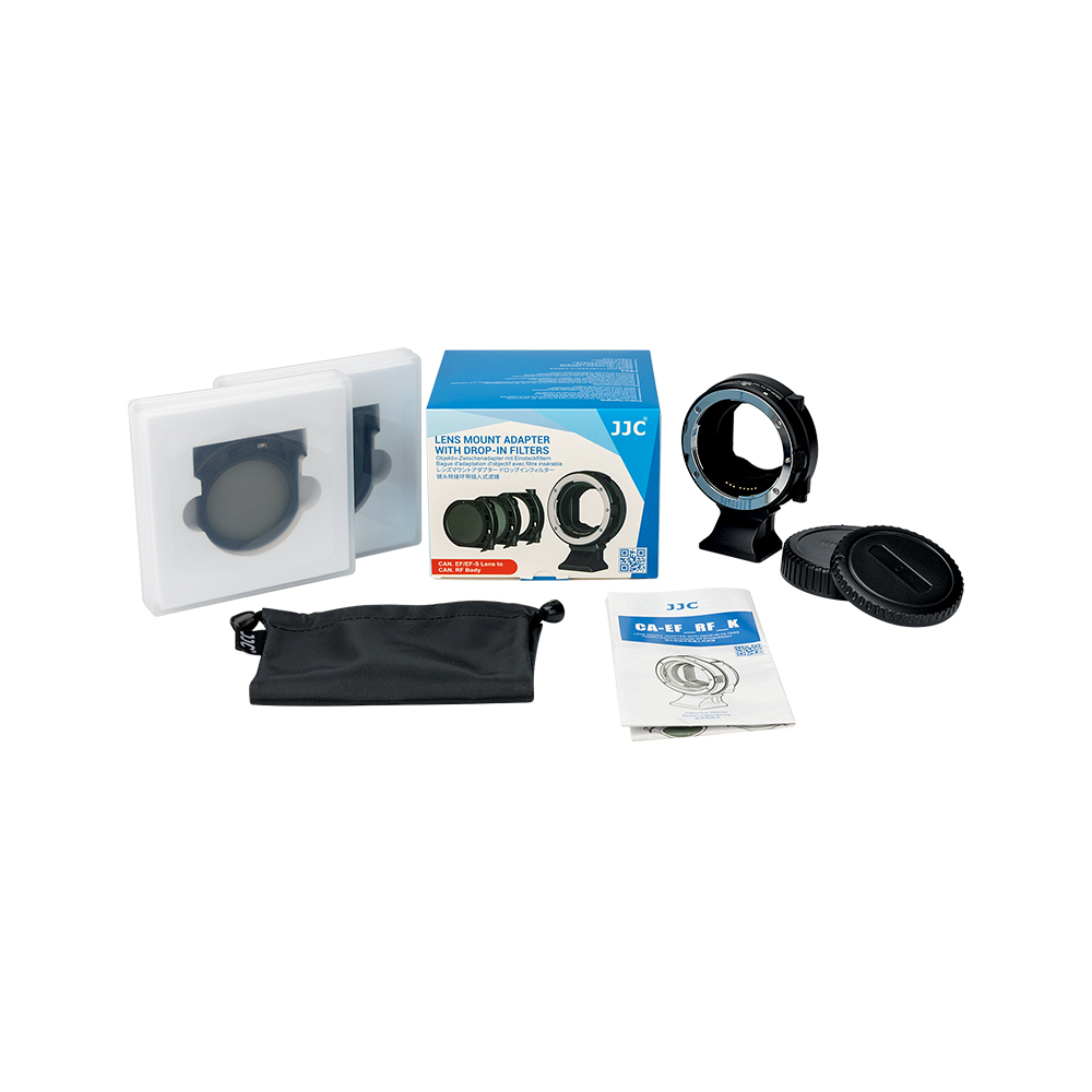 The JJC CA EF_RF_K replaces Canon Drop In Filter Mount Adapter EF EOS R, which allows you to mount any Canon EF/EF S lens onto the Canon RF mount camera body. Besides that, a Drop In CPL Filter and a Drop In NDV Filter (ND3 ND500) are included in the package for you to shoot with a filter conveniently; When the filters are not mounted, the Drop In Filter Frame can be mounted to prevent dust from entering the adapter, thus protecting the camera's CCD/CMOS, and prevent light leak as well.