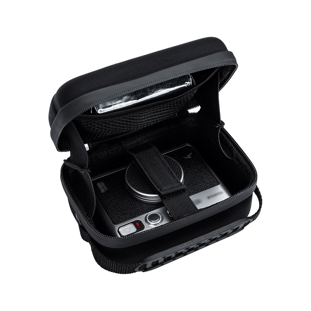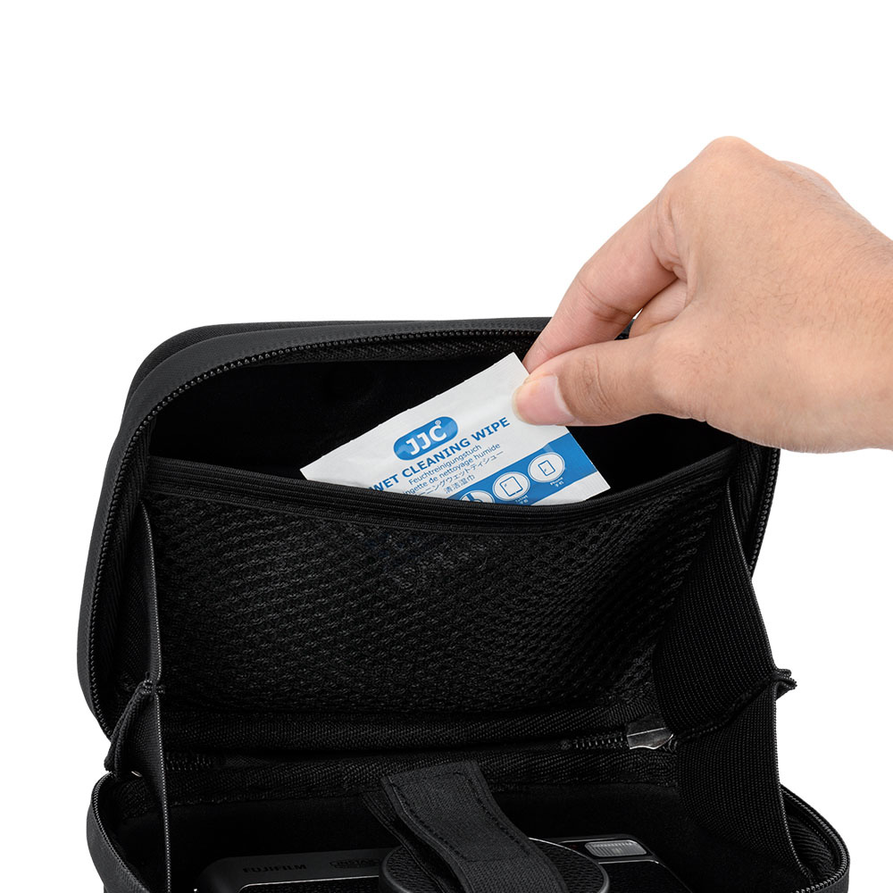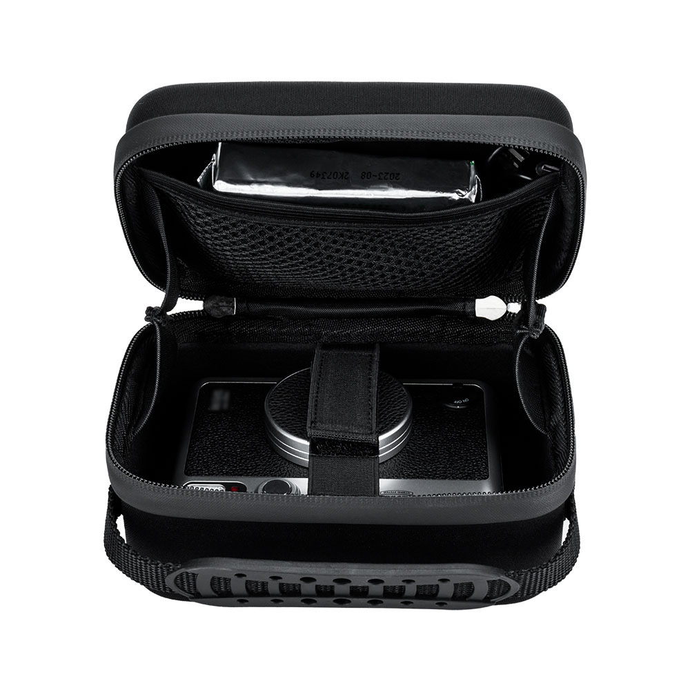 Pouzdro na fotoaparát JJC HSCC IME BLACK je speciálně navrženo pro instantní fotoaparáty, jako je FUJI. Instax, LEI. SOFORT, Koda. Mini Shot series, a také kompaktní fotoaparáty, jako je FUJI. X100 a SON. ZV E1. Uvnitř se nachází elastický pásek na suchý zip, který fotoaparát drží, čímž je bezpečnější a snižuje vibrace. Horní kryt obsahuje síťovanou kapsu pro uložení předmětů, jako je filmový papír, čisticí tyčinky a nabíjecí kabely. Elastické pásky na obou stranách vnitřního prostoru spojují horní a spodní víko, čímž zabraňují přílišnému otevření víka a vypadnutí předmětů.