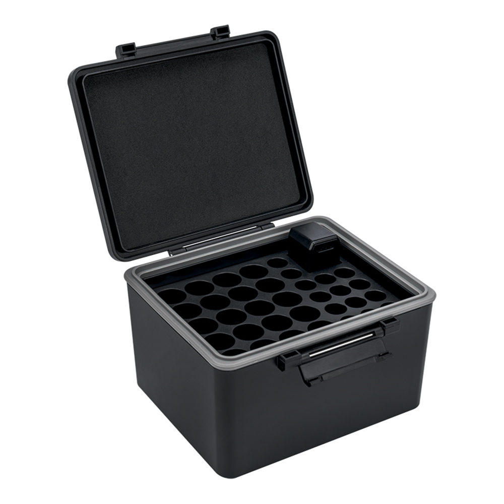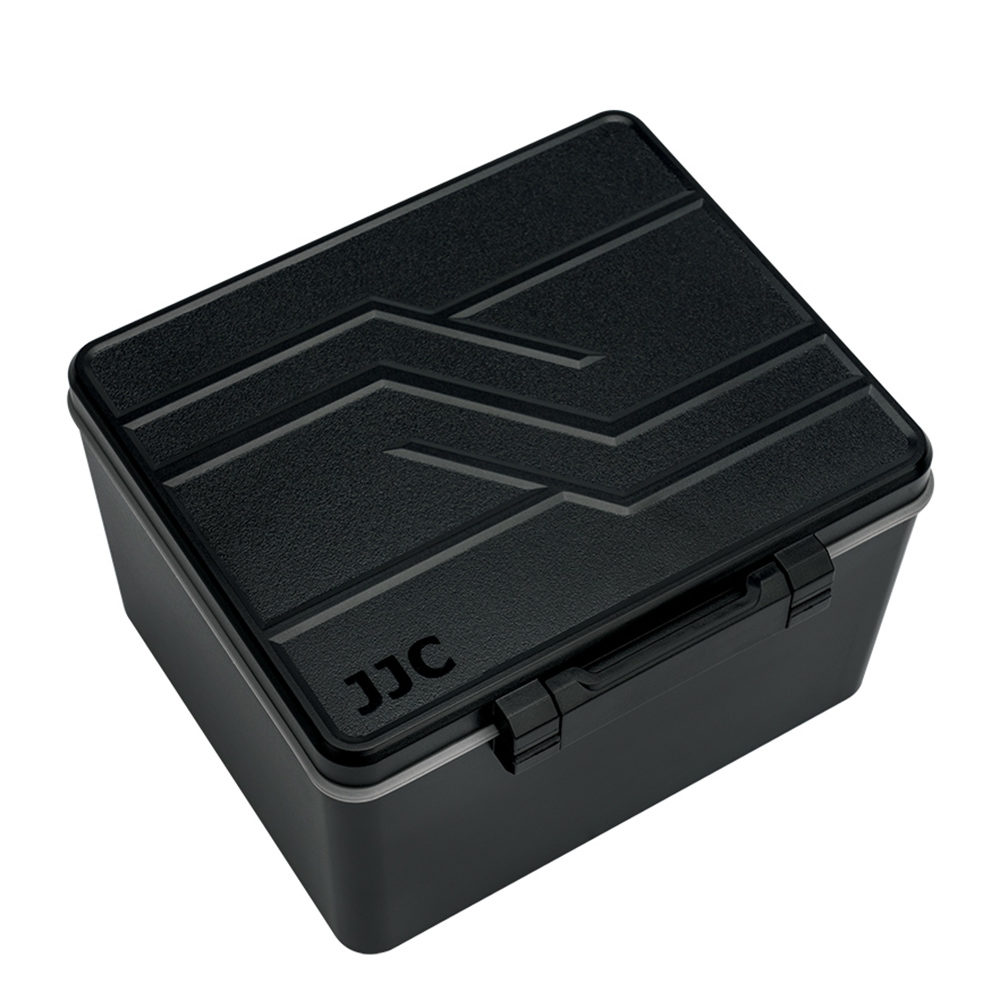 Plastový kufřík JJC JBC 34AK je box pro uložení 20 baterií AA nebo 14 baterií AAA. Je vyroben z pevného materiálu ABS a je odolný proti tlaku, vlhkosti a nárazům. Na míru vyrobený držák pomáhá udržet baterie úhledně na svém místě a zabraňuje náhodnému kontaktu baterií, který by mohl způsobit požár nebo výbuch. Víko krabičky je vyloženo pěnou, která zabraňuje chrastění baterií nebo jejich poškození třením. Ergonomicky tvarovaný zámek zajišťuje snadné otevírání víka.