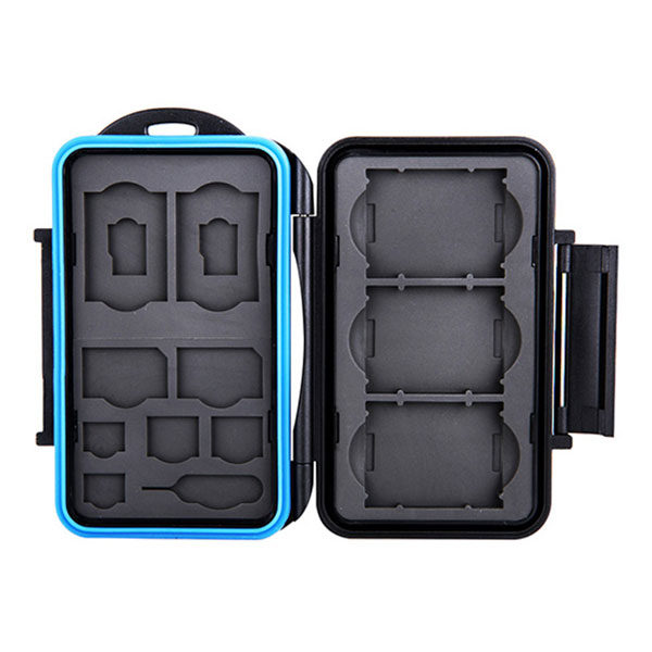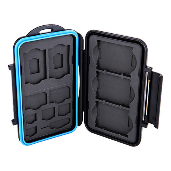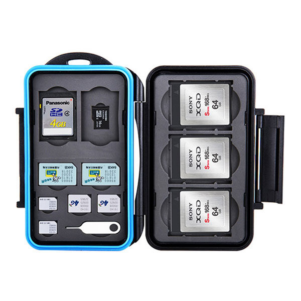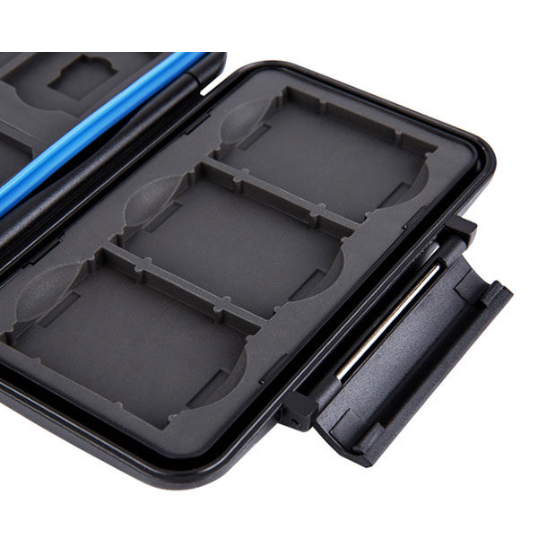 Pouzdro na paměťové karty JJC MC STMQ13 je pevný a odolný proti stříkající vodě box pro tři paměťové karty XQD nebo CFexpress typu B, dvě paměťové karty SD, dvě paměťové karty micro SD, dvě karty SIM, dvě karty micro SIM a dvě karty nano SIM. Tvarovaný gumový vnitřek absorbuje veškeré nárazy a karty SIM zůstanou na svém místě, pokud pouzdro na paměťové karty vložíte do tašky nebo kapsy. Vaše cenné karty jsou také dobře chráněny před prachem a jinými nečistotami. Ergonomický uzamykací systém se snadno otevírá a opět zavírá.