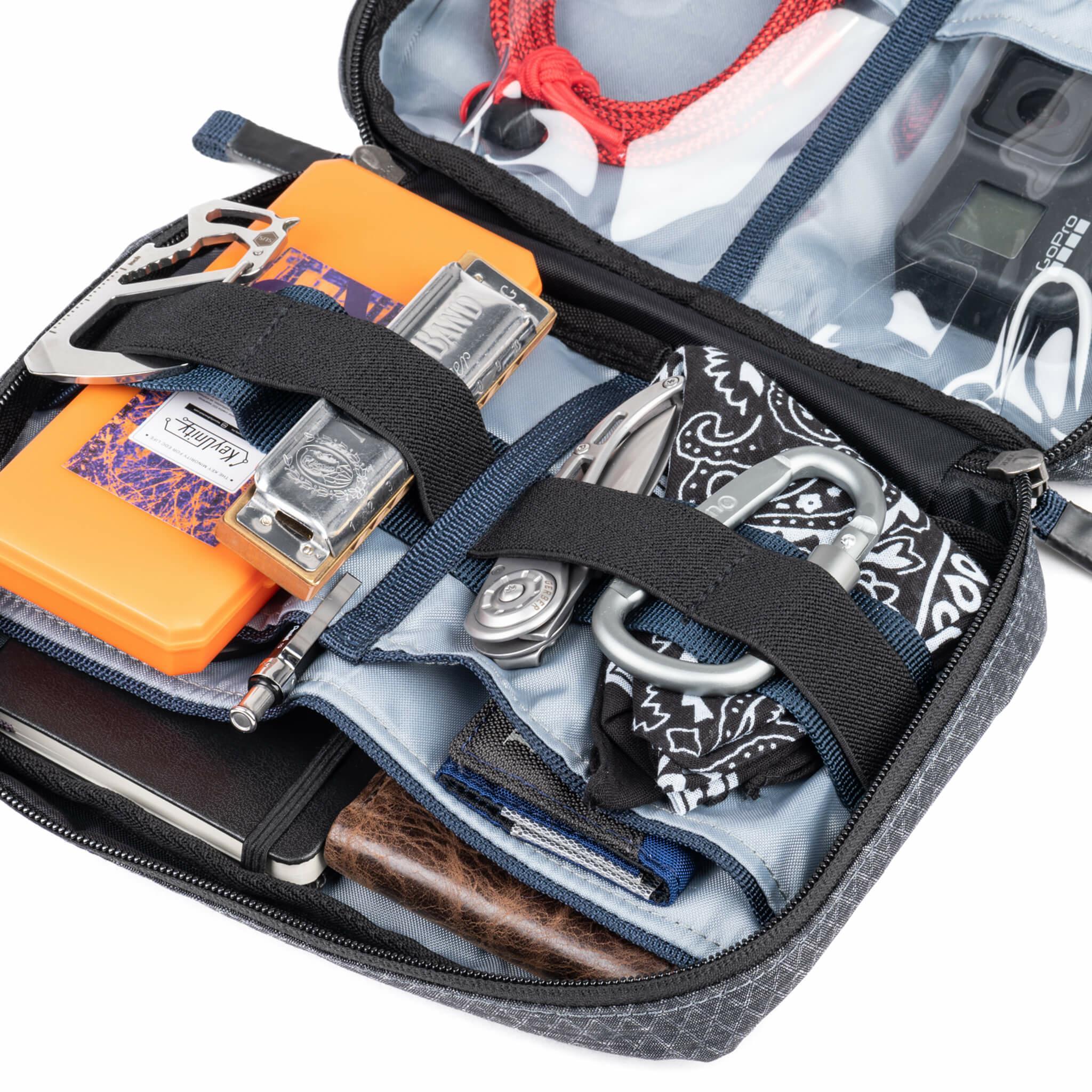 Tired of fumbling through your backpack looking for that computer dongle only to discover that you forgot it at home? Keep all your tech accessories together in an organized pouch so everything is at your fingertips when you need them. Like the old idiom says, “a place for everything and everything in its place.” KEY FEATURES Open book design provides full access and visibility Six pockets and six web rail slots for ultimate organization Two loops convert the bag to cross body carry when paired with a shoulder strap SPECIFICATIONS Exterior Dimensions: 9.0 W x 6.25 H x 2.5 D (22.9 x 15.9 x 6.4 cm) Volume: 2.5 liters Weight: 5.5 oz (160 g) WHAT FITS IN THIS BAG? Memory Cards Pocket knife Pens Connector cables and dongles Batteries Phone Harmonica