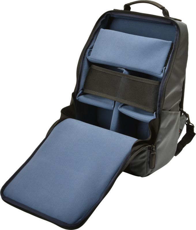 Batoh na fotoaparáty s koženými akcenty na přední straně, které vytvářejí tradiční a elegantní atmosféru.Tvar tohoto batohu je navržen tak, aby minimalizoval jeho mrtvý prostor, čímž je dosaženo elegantní formy a praktičnosti. Do hlavního prostoru se vejde tělo středně velké digitální zrcadlovky, čtyři výměnné objektivy a 13palcový notebook.