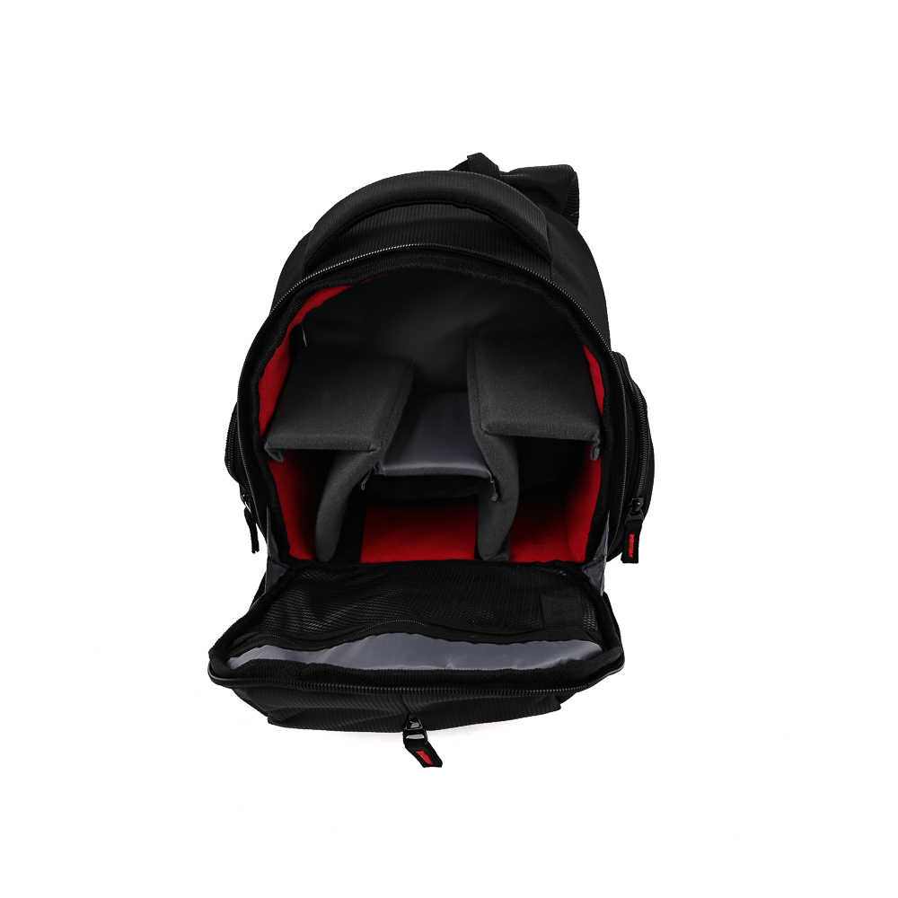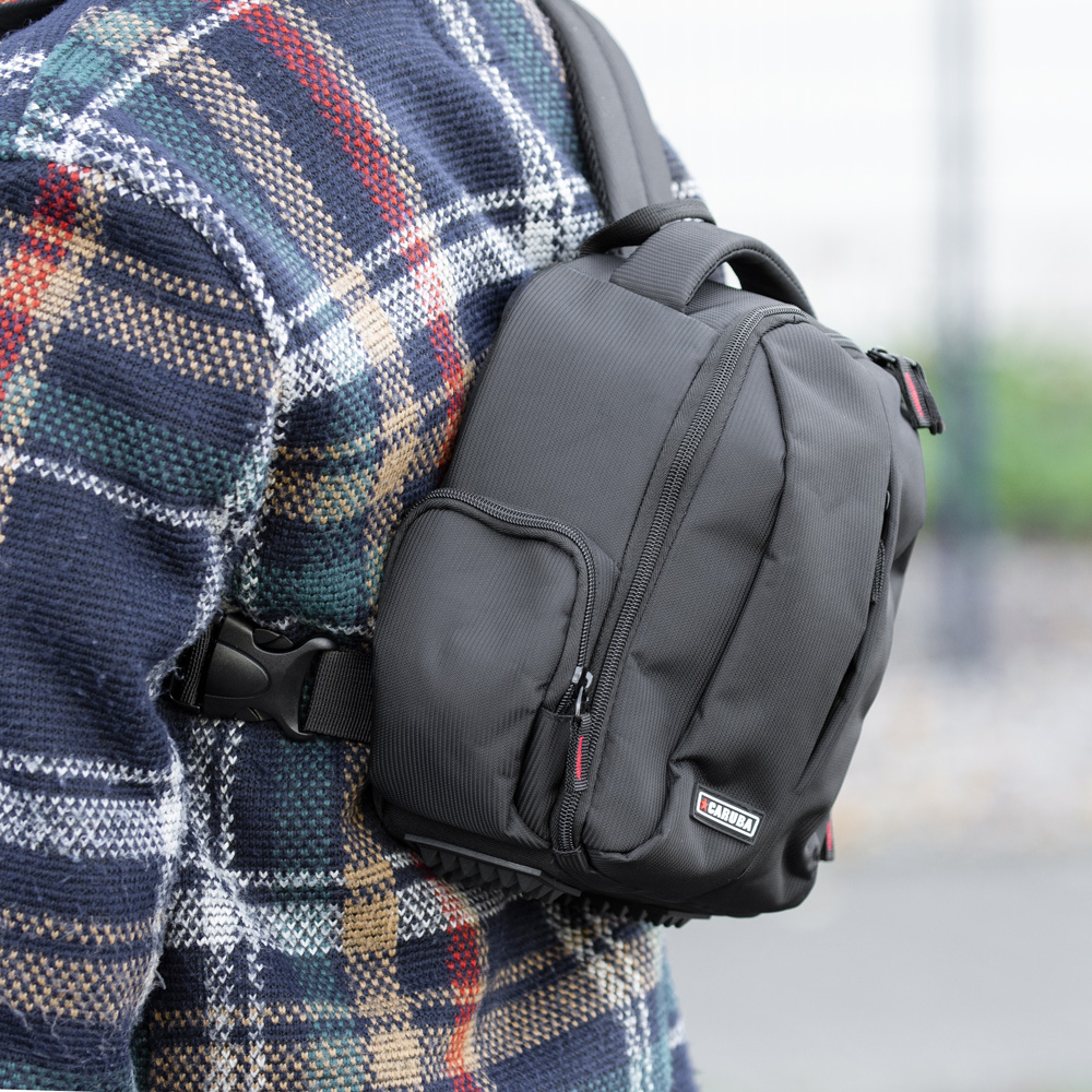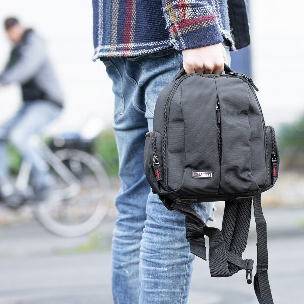 The Caruba Andex 100 backpack is a compact sling backpack where you can store a compact DSLR or a system camera with a standard 18 55 lens. There is room for two extra lenses that have a somewhat smaller size and there is also room for a flash. The dividers are removable, so for a different setup the interior can be adjusted as desired.