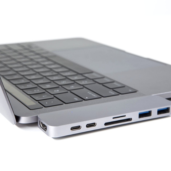 Caruba Duo Hub features HDMI, Thunderbolt 3, USB C, SD, microSD and two USB 3.0 outputs. The adapter's aluminum housing makes it a perfect match for your MacBook Pro.