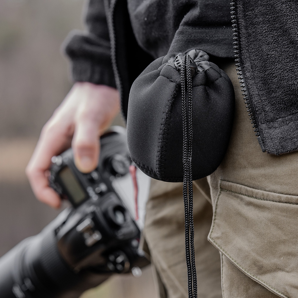 The lens bag is made of neoprene, giving your lens extra protection against bumps and shocks. Thanks to the drawstring, the bag closes tightly, preventing dust and dirt from getting onto your lens. The bag fits perfectly in your camera bag, but you can also attach it to your belt or attach it to your gear with the carabiner.,
