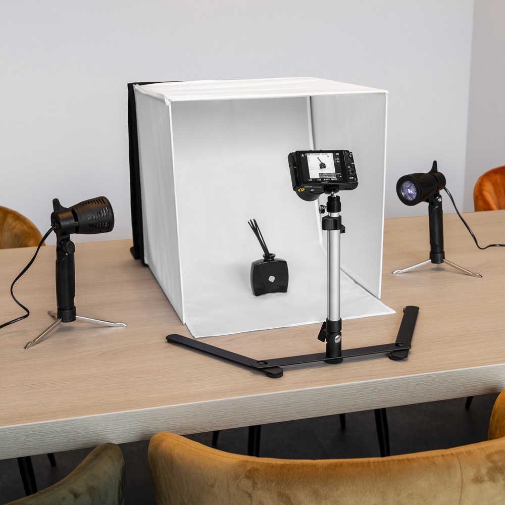 The mini studio, once unfolded, has a size of 40 x 40 x 40 centimeters. Ideal for taking product photos wherever you want! The background can also be quickly attached using Velcro. With the white, black, red or blue background you immediately create the desired atmosphere. Moreover, these colors are easy to use as a background for subjects that need to be detached. By turning the lamps closer or further from the Caruba Portable Photo Studio you can determine the brightness of the light. ,