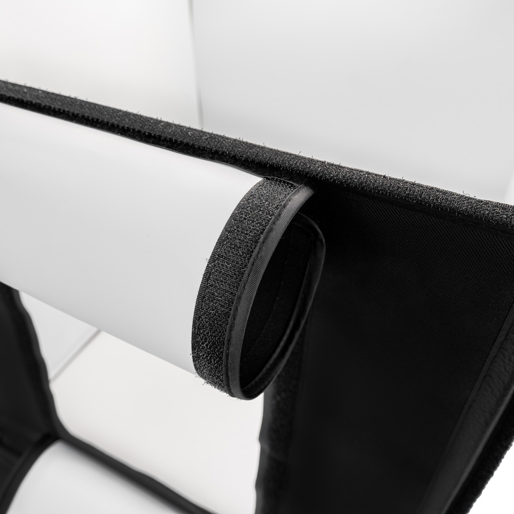 Transform this compact and sturdy carrying case into a very complete Caruba Portable Photo Studio with four different backgrounds, a diffuse cloth for the light and dimmable LED lighting in the top. You can determine the color temperature between 3300 and 5600 Kelvin. The transformation from bag to studio is done in an instant by opening the bag at the back and unfolding the sides. The position of the walls can be secured with Velcro.