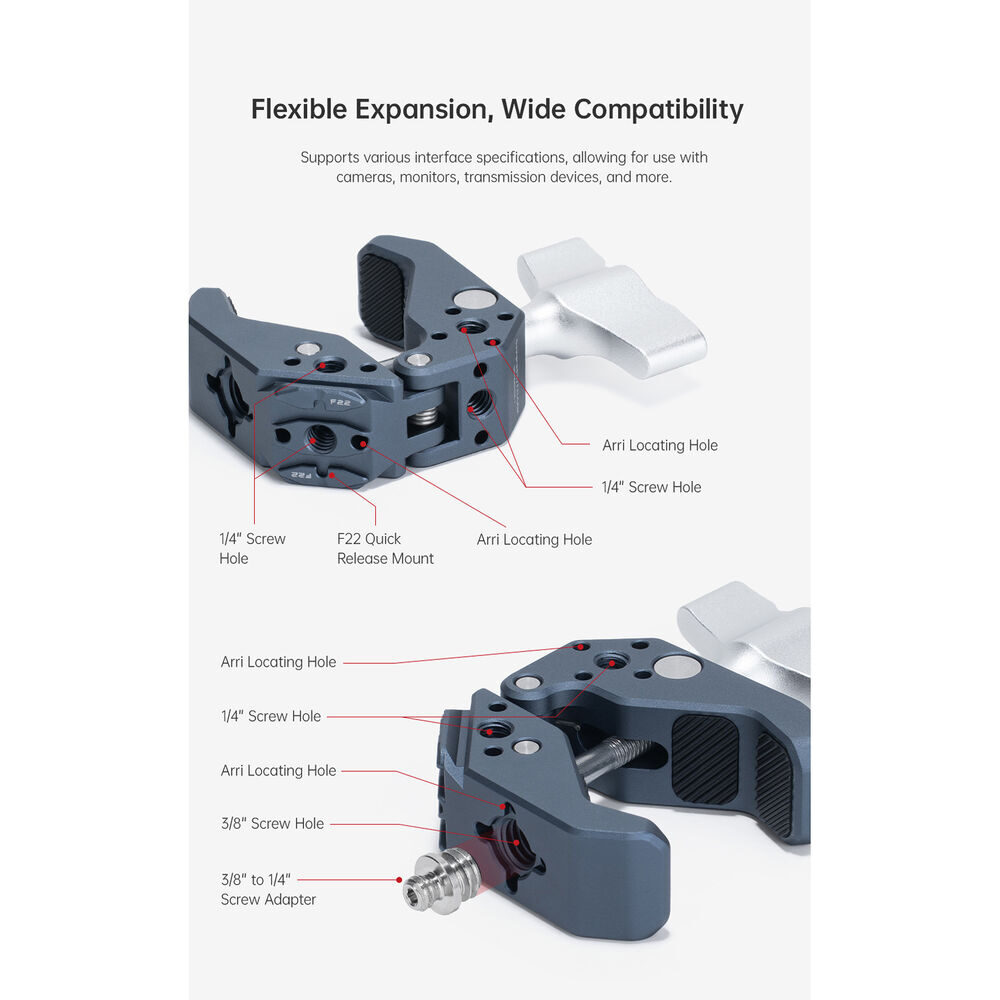 This super clamp supports various interface specifications, including 1/4‘ 20 and 3/8’ 16 threaded holes, F22 Quick Release interface and Arri locating holes. As a result, it fits perfectly with accessories from brands such as SmallRig, Atomos, Hollyland and Rode. Easily attach cameras, monitors, wireless video systems, LED lights and microphone holders. Its wide compatibility makes it a versatile addition to your kit, ideal for a variety of shooting situations.