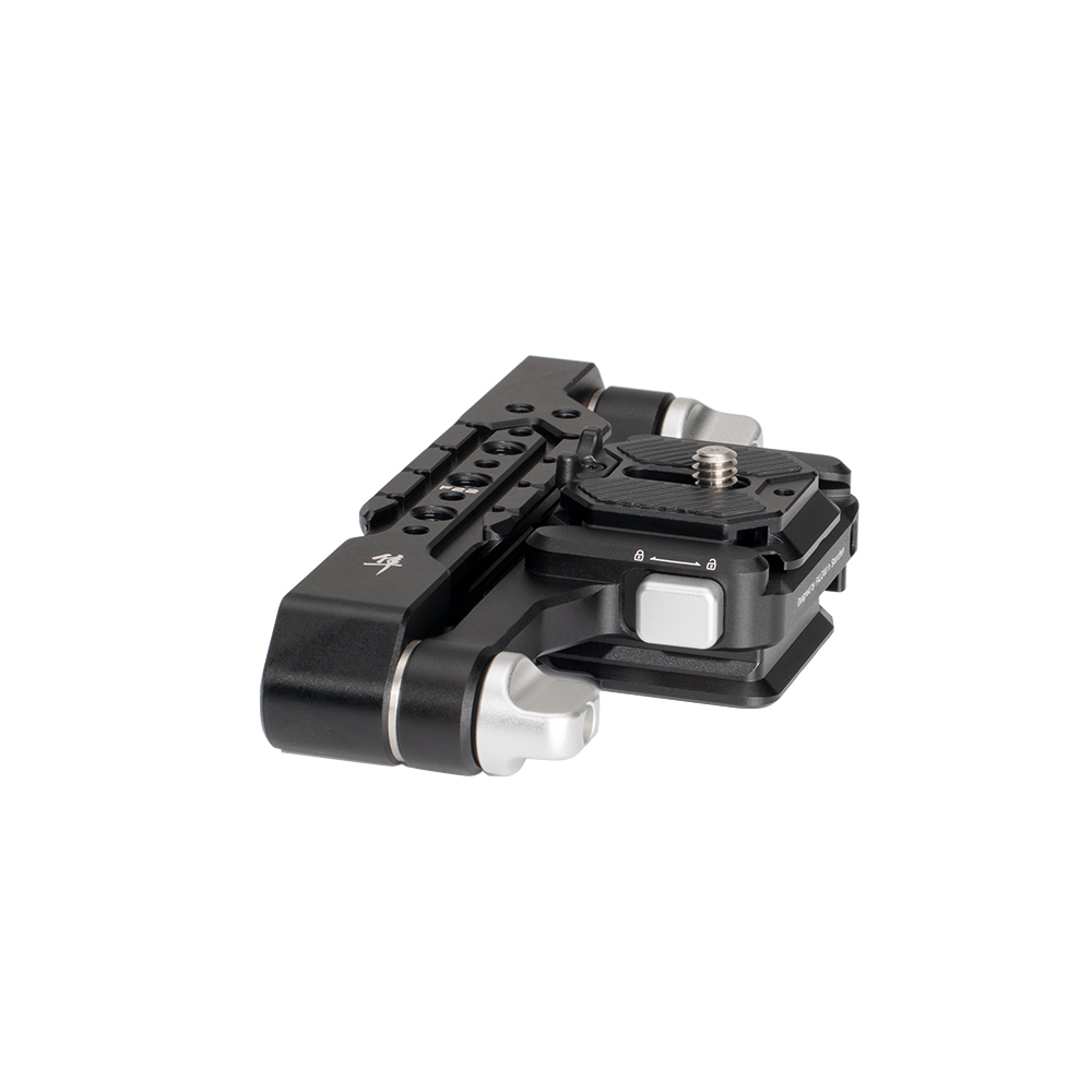 The half cage features F22, F38 and F50 quick release mounting points, a 1/4" screw hole, Arri positioning hole, cable clamp positioning hole, strap hole and cold shoe to allow various accessories to be mounted. The bottom plate includes an F38 quick release interface that can be used to mount a quick release plate with camera.