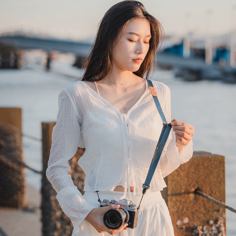 The camera strap length is adjustable in two directions, from 790 to 1400 mm. Adjust the belt length easily and quickly with one hand thanks to the suede pull tabs.