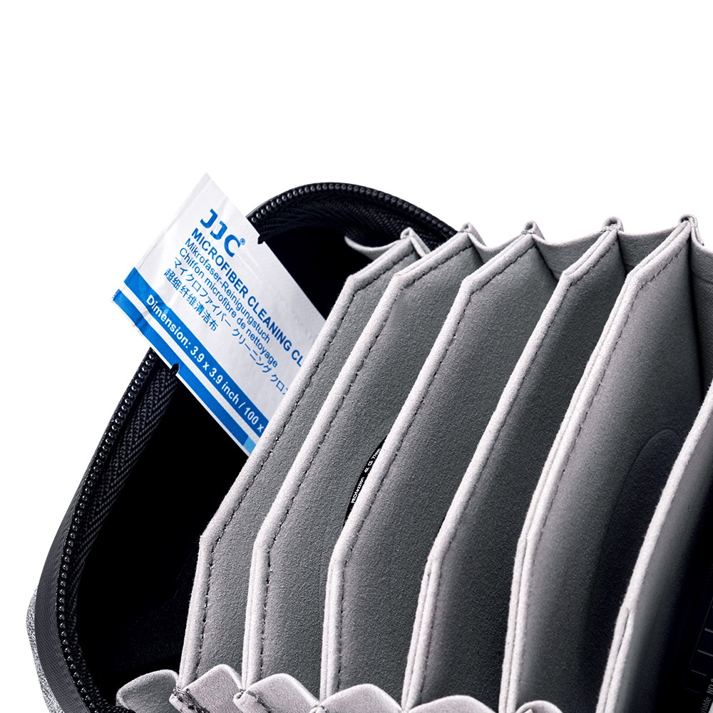 The exterior of the filter pouch, with reinforcing rib, is made of premium EVA material, sturdy and durable. Filters placed within this pouch are each held within one of ten separate microfiber liner pockets and can be easily accessed by opening its zipper closure. You are easy to see all filters at once and quickly get them in and out. Additionally, the filter pouch comes with a vacuum packaged microfiber cleaning cloth, which effectively removes dust, fingerprints and oil smudges without leaving residues. ,