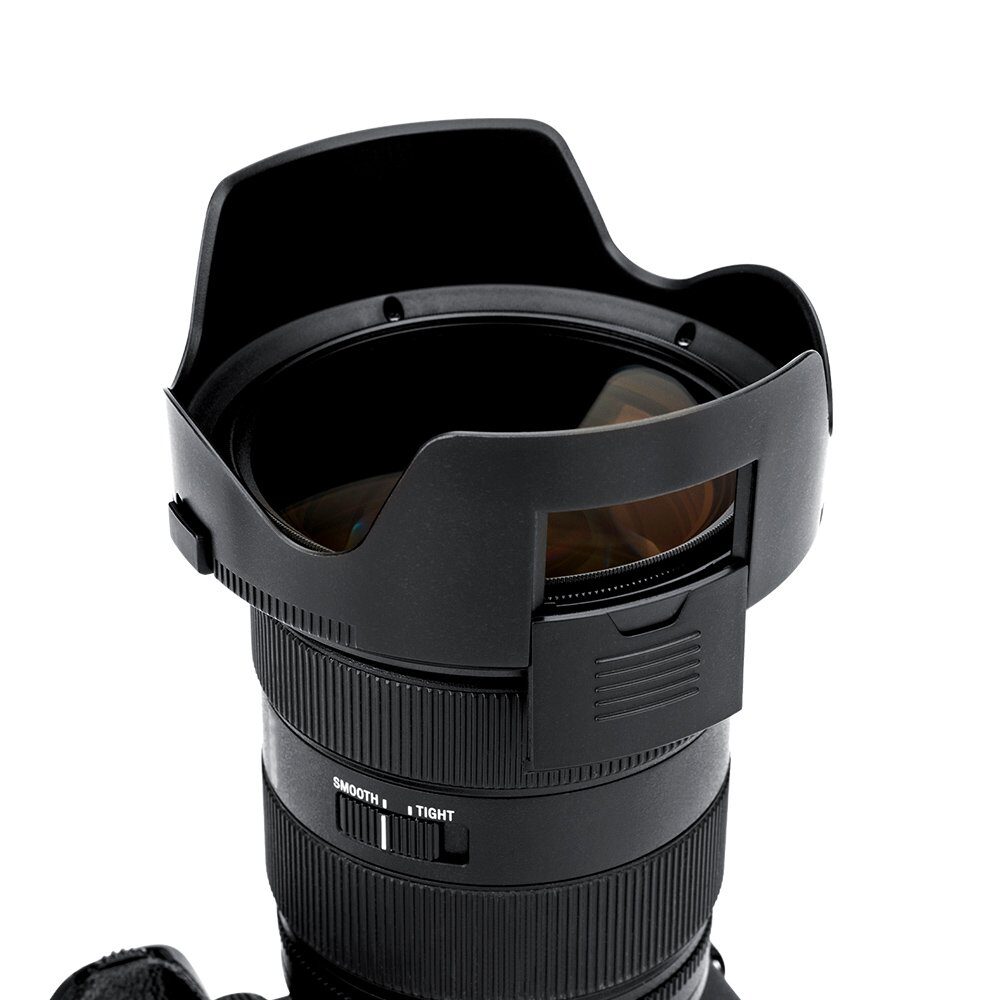 The lens hood accommodates an 82mm diameter filter and a lens cap. A special filter adjustment window allows for easy operation of adjustable filters, such as polarising and variable ND filters, without having to remove the lens hood,