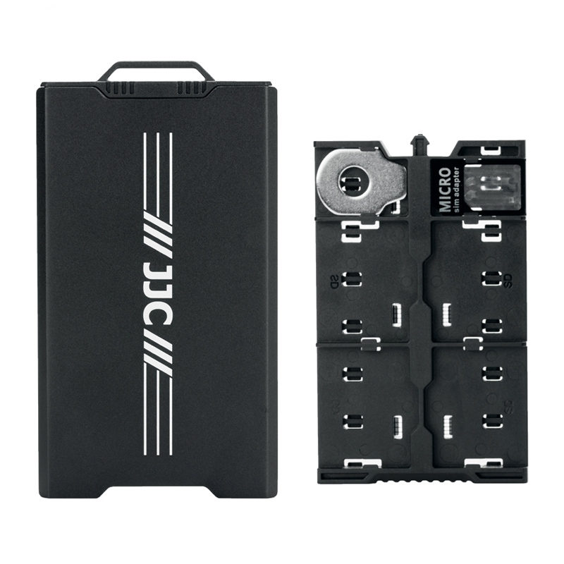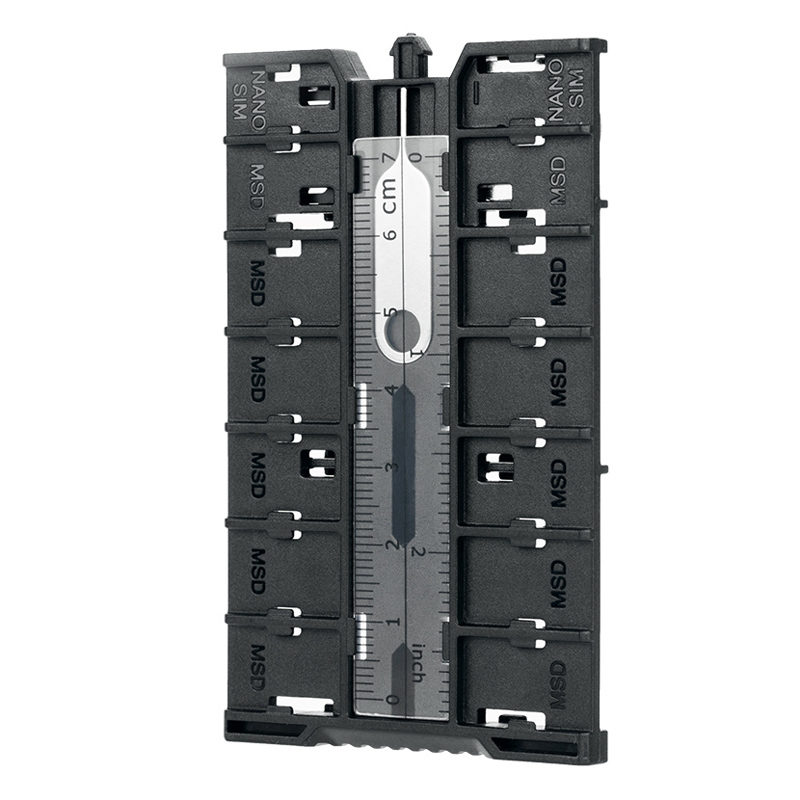 Na jednu stranu úložného šuplíku můžete uložit 4 karty SD, 1 adaptér micro SIM a 1 plochý šroubovák, zatímco na druhou stranu úložného šuplíku můžete uložit 12 karet micro SD, 2 karty nano SIM/NM, 1 nástroj na vyjmutí karty a 1 mini pravítko.