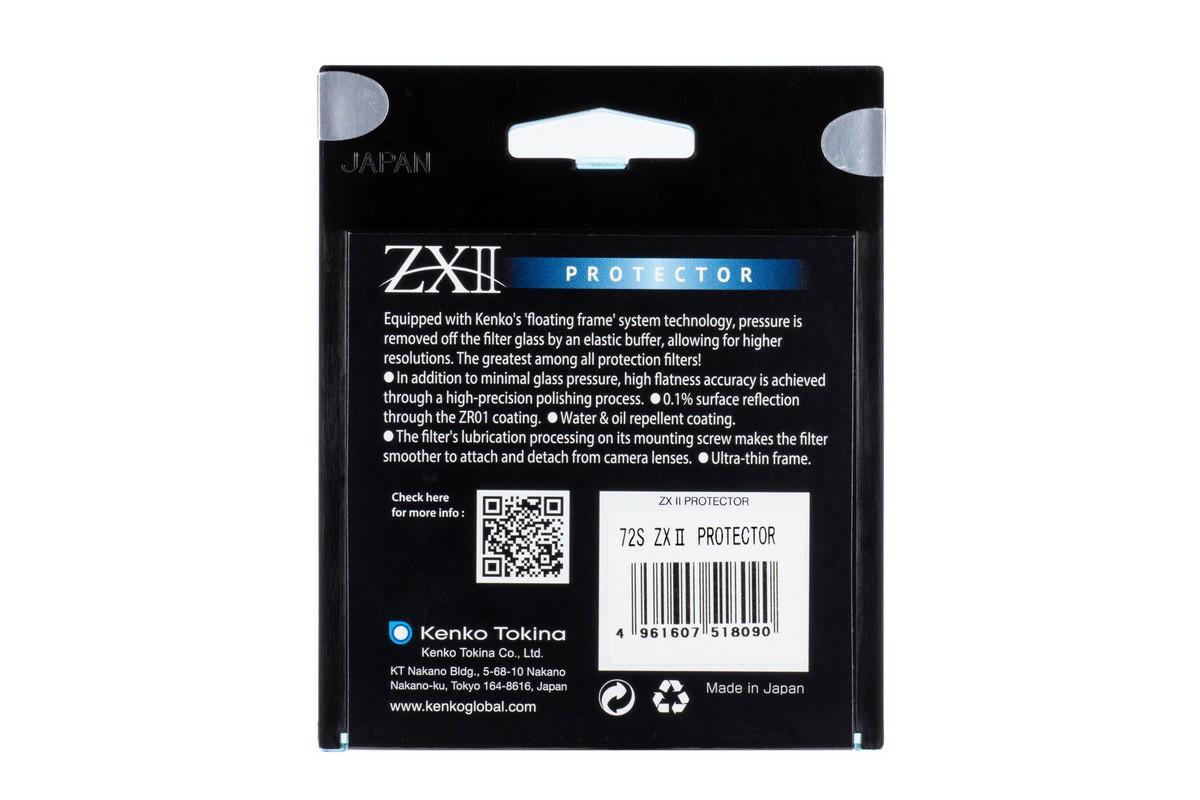 Keno ZX II Protector to najnowsze filtry ochronne japońskiego producenta. Posiadają innowacyjną technologię Floating Frame dzięki której mogą być wykorzystywane w pracy z aparatami i kamerami o rozdzielczości 4K i 8K. Kenko przeprowadziło serię badań z których wynikła iż duży wpływ na jakość obrazu ma tradycyjna technologia montażu szkła wewnątrz pierścienia. W naprężonym szkle mogą powstawać bardzo niewielkie zniekształcenia które jednak mają duży wpływ na spadek rozdzielczości. W odpowiedzi na ten problem Kenko opracowało technologię Floating Frame. Jest to elastyczna warstwa amortyzująca znajdująca się między szkłem a ramą oprawki filtra. W serii ZX II Protector producent wprowadził także powłokę ZR01. Jest ona odpowiedzialna za likwidację odbić świetlnych i sprowadza poziom refleksów do znikomego poziomu 0,1 %. Filtry posiadają także skuteczną powłokę hydrofobową która ułatwia praktyczną obsługę filtra.