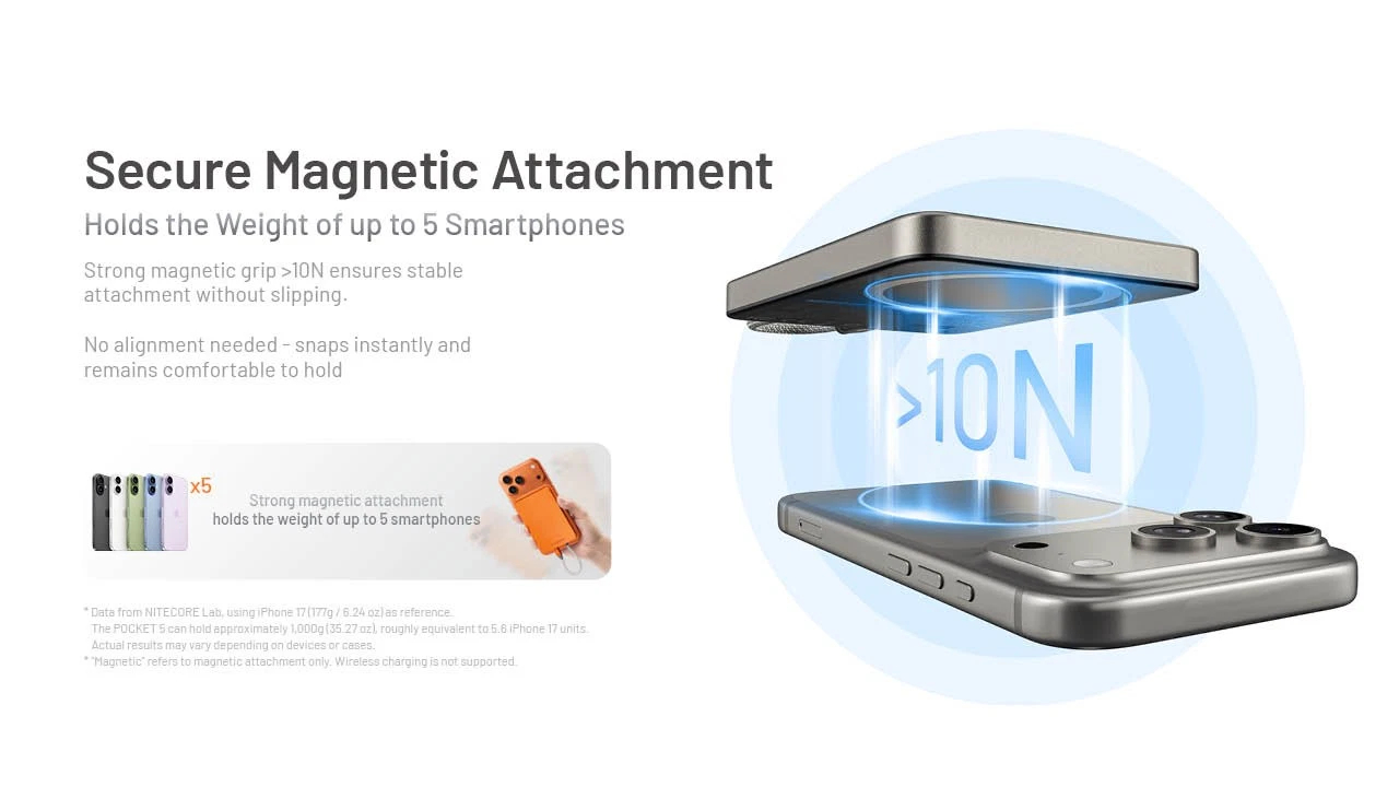 The Nitecore POCKET 5 Magnetic Ultra Thin Power Bank Alloy Orange is an ultra thin and powerful energy boost for on the go. Weighing only 125 grams and with a slim profile of 9 mm, it fits effortlessly in your pocket or bag. Thanks to its strong magnetic grip of more than 10 N, it stays firmly in place.