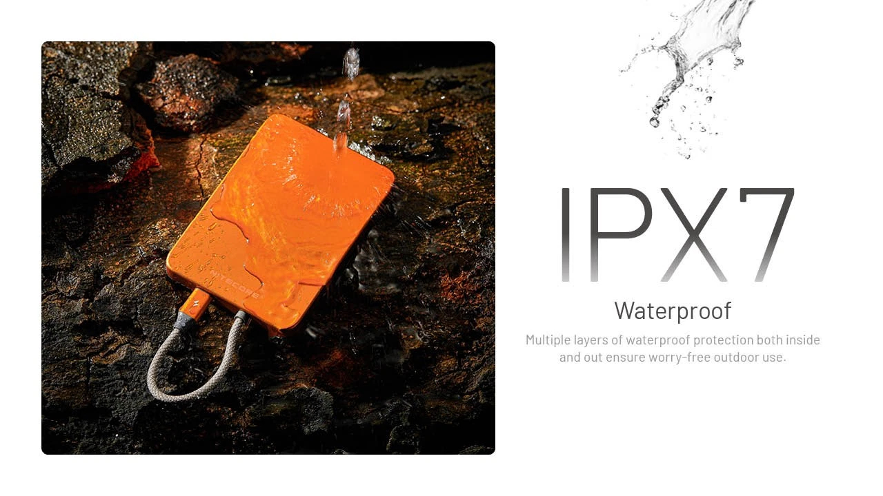 The built in USB C cable eliminates the need for separate cables, and thanks to its IPX7 waterproof rating, it can withstand rain and splashes. ,