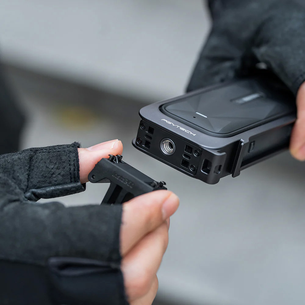 The cage is custom made for the Insta360 X5 and ensures seamless access to buttons, battery and microphone holes. The cut out at the top minimises signal interruption for optimal performance. Expansion ports on the side allow accessories to be added, and the base supports both the Insta360 quick release system and standard 1/4’ mounts.