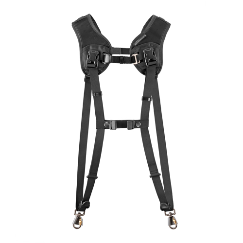 The length of each strap can be adjusted from 91 to 160 centimetres and the strap itself is 2.5 centimetres wide. The spring loaded bumper locks can be easily moved up and down along the strap, allowing you to control your camera's clearance. When you attach the optional BlackRapid Binocular Breathe Strap, you can also hang your binoculars on the harness. If you want to carry only a single camera, you can detach the Double Breathe to have two shoulder straps available.,