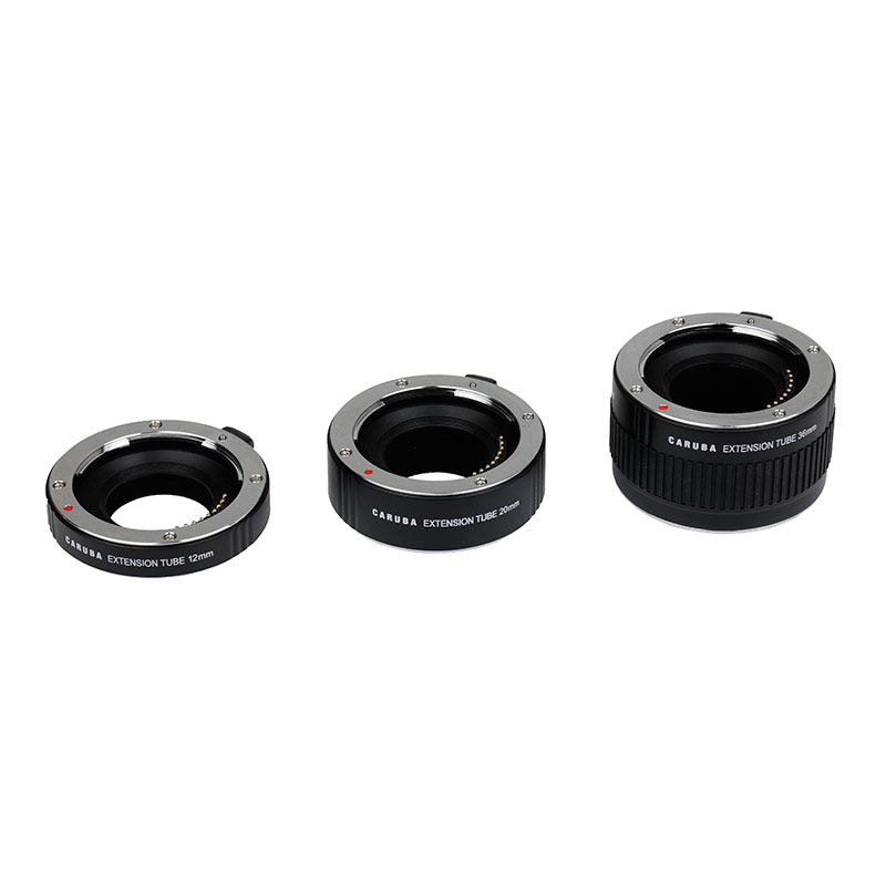 The Caruba Extension Tube set Chrome for Olympus consists of three extension tubes that can be used separately, or combined. The extension tubes do not have any optical elements and therefore it is possible to photograph subjects larger and from a closer distance, without changing the quality of the image. The extension tubes have a chrome mount and are compatible with older Olympus Four Thirds lenses. Features such as auto focus and TTL light metering continue to work as usual. However, it is recommended to focus manually, as focus is very tight.