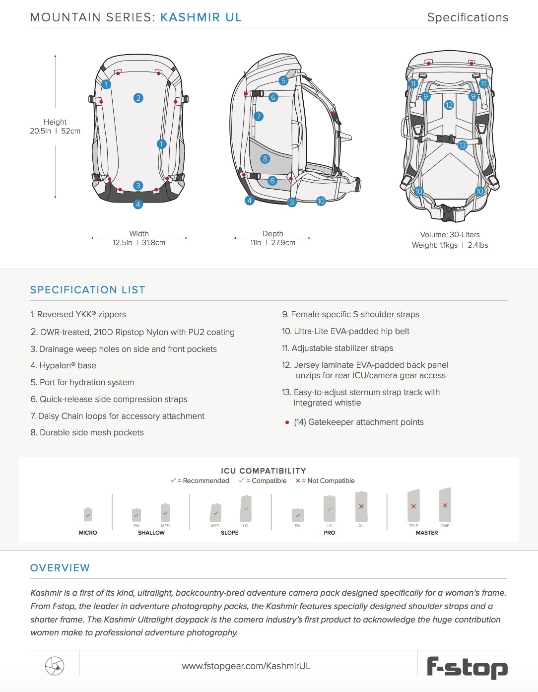 The F Stop Kashmir UL Backpack is an ultra lightweight all round bag designed for active female photographers who are looking for an ideal solution for safely transporting their equipment. The design is stylish, but extremely functional. This way you can easily take your DSLR or system camera with lens, extra lenses, a flash and a tripod ... wherever you go!