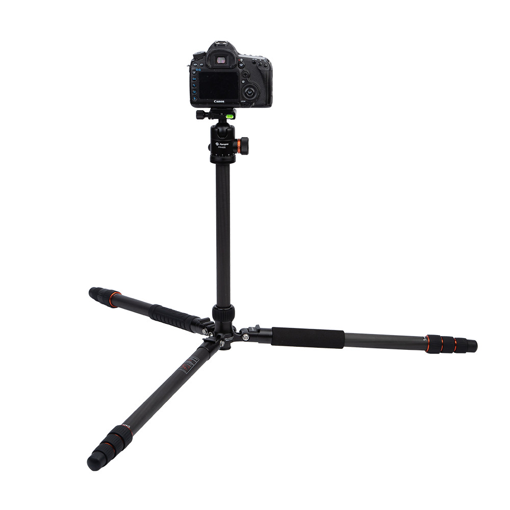 The black Fotopro X GO Max is a 4 section carbon fiber support that has a twist lock leg system that allows, along with the rapid center column, for a maximum height of 171cm. Splaying the legs completely out enables the tripod to go as low as 46cm, and the variable leg angles allow the tripod to conform to uneven terrain.