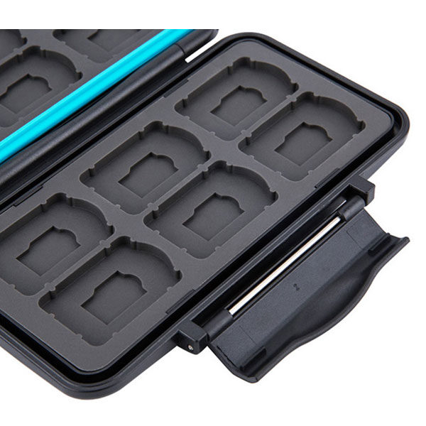 Pouzdro na paměťové karty JJC MC NSMSD24 je pevné a odolné proti stříkající vodě pouzdro na dvanáct herních karet Nintendo Switch a dvanáct paměťových karet micro SD. Tvarovaný gumový vnitřek absorbuje veškeré nárazy a zajišťuje, že paměťové karty zůstanou na svém místě, když pouzdro Multi Card Case vložíte do tašky. Zároveň chrání vaše cenné karty před prachem a jinými nečistotami. Ergonomický uzamykací systém se snadno otevírá a znovu zavírá, a.,