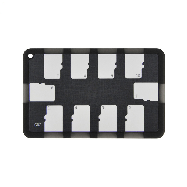 The JJC MCH MSD10GR Memory Card Holder Black is extremely handy when you use multiple memory cards and need an easy and compact storage place for them. The card holder has the size of a bank card and offers space for up to ten micro SD cards thanks to pre shaped cutouts. These keep your cards securely in place, yet they can be easily taken out again. Due to its compact size, you can simply store the JJC Memory Card Holder in the same place as your bank cards and/or your driving licence. You can even keep it on your key ring through the hole in the housing.,
