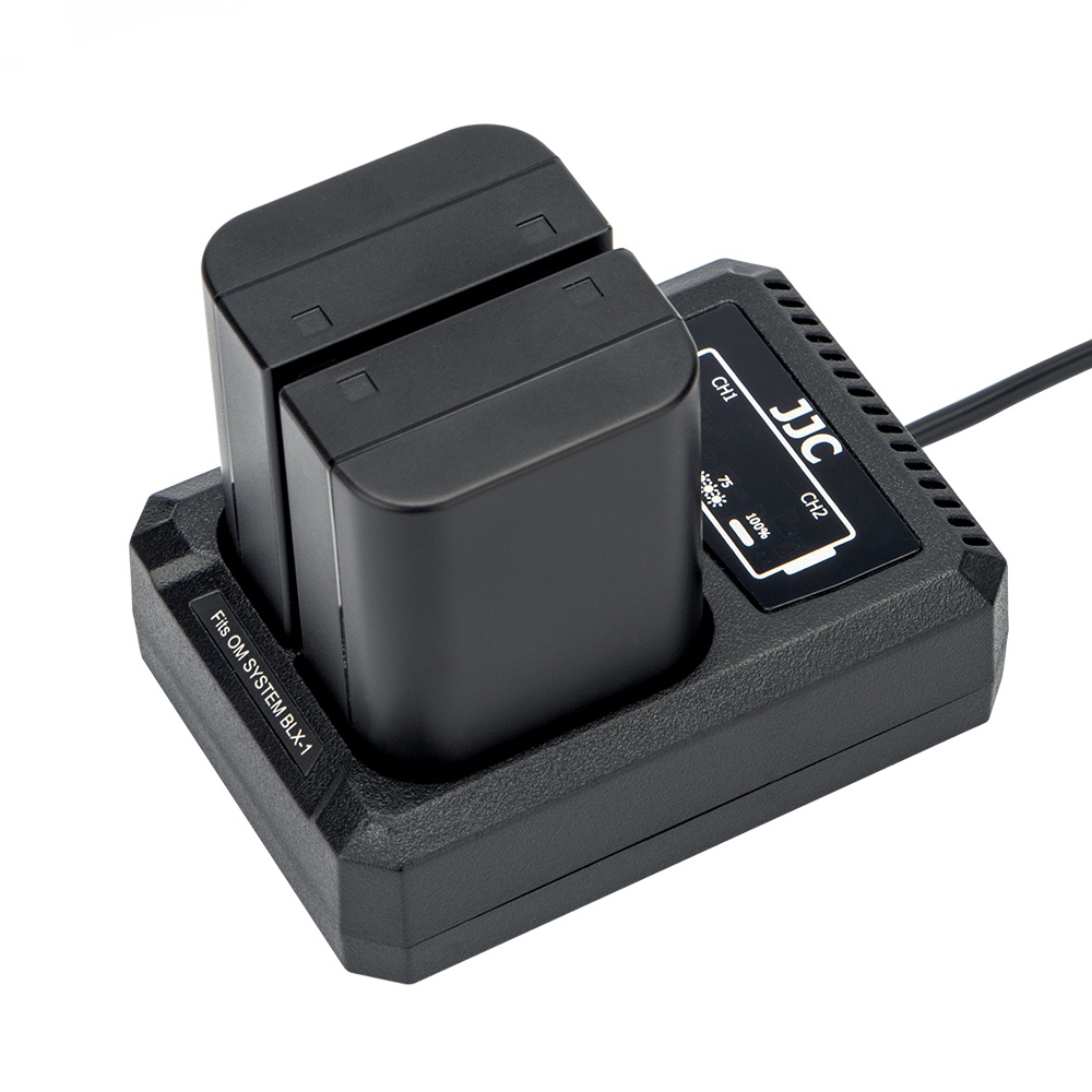 JJC DCH BLX1 USB Dual Battery Charger is specially designed for charging Olympus OM System BCX 1 Lithium ion Battery, which allows you to charge one or two BLX 1 batteries at the same time. Powered by USB sources, you can charge your battery with AC adapter, laptop, power bank or car charger, which enables you to refresh your battery wherever and whenever, thus prolonging your photography time. The 2 indicators show the status of the battery, and they will flash when charging and be constant on when charging is complete. Besides that, the charger will automatically detect when the batteries are fully charged and stop charging to prevent damage to your batteries. In addition, with the built in USB cable, this battery charger is convenient to carry. ,