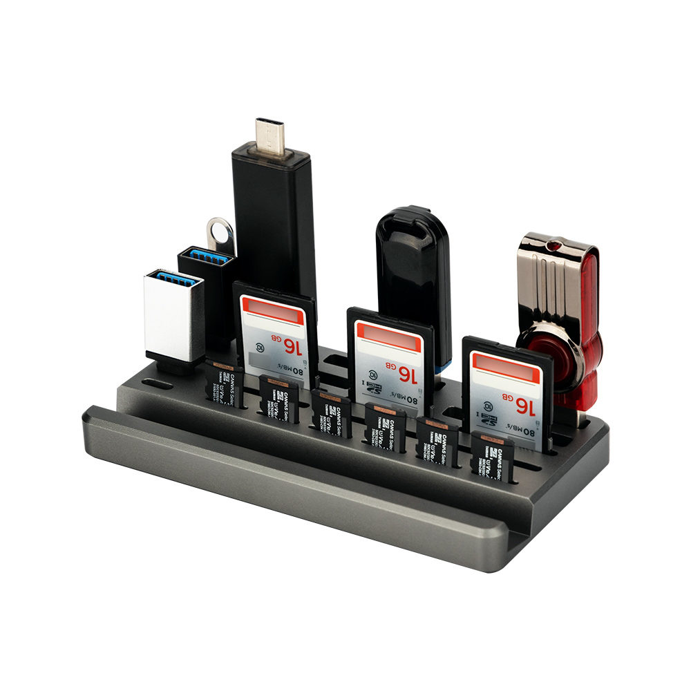 Holds 6 SD cards, 6 Micro SD cards, 10 USB A USB sticks, 4 USB C USB sticks and a smartphone
