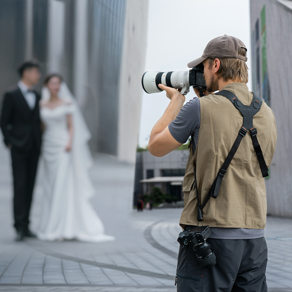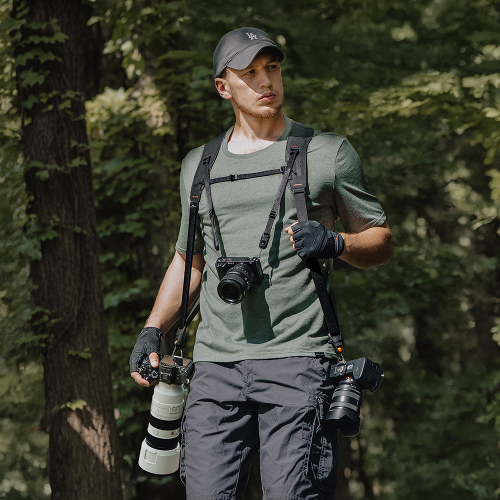 The PGYTECH Camera Strap Master Midnight Black is not a standard camera strap. It is a well designed, professional carrying system for anyone who wants to have their camera quickly at hand, without hassle or neck pain. The professional design with the double shoulder strap distributes the weight evenly and supports up to three cameras with telephoto lens, zoom lens and prime lens, or binoculars.