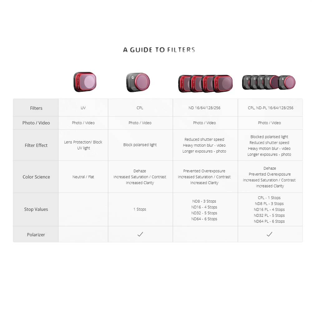 This set includes four ND filters (16, 64, 128 and 256) and allows you to adjust your DJI Mini 3's shutter speed and create visual effects.