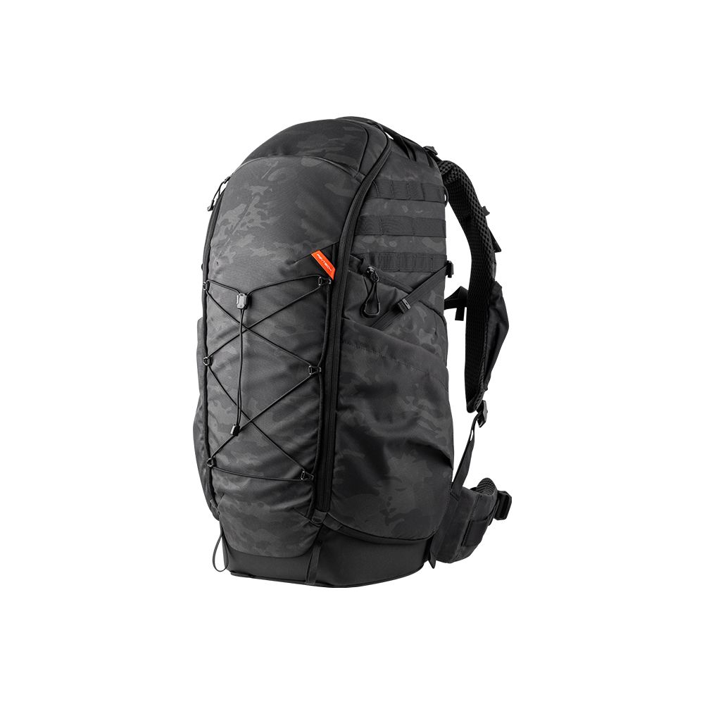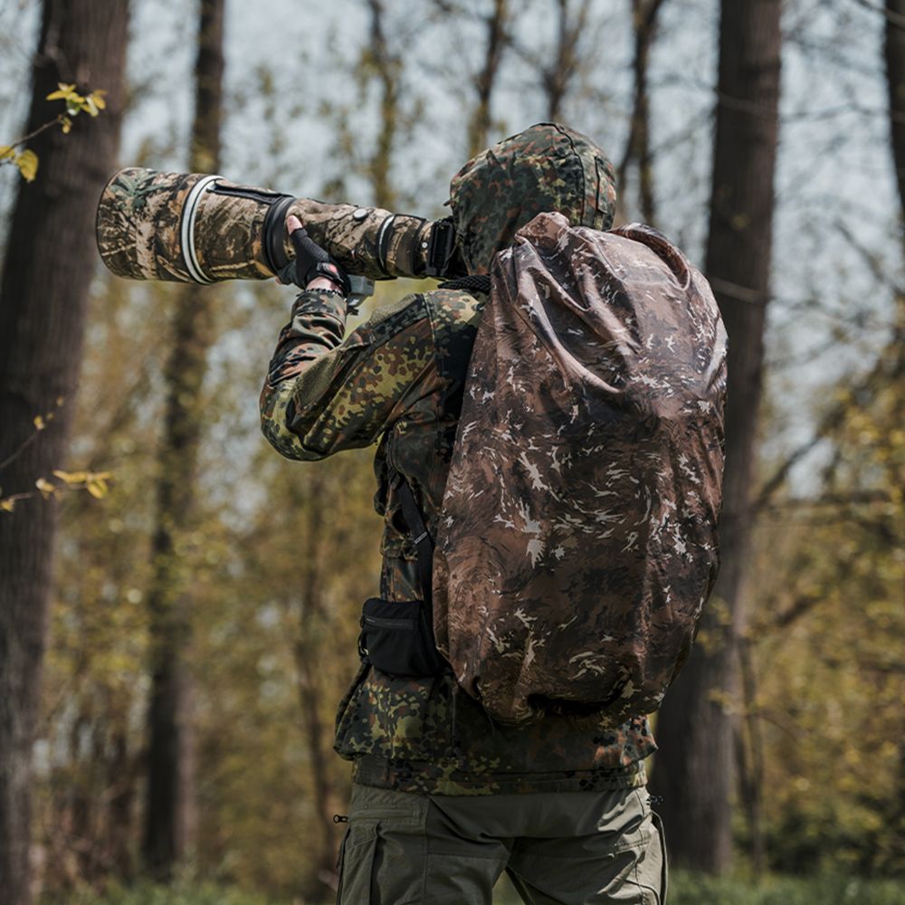 The rain cover is camouflaged with a leaf print. When open, it can be used as a waterproof mat for handling equipment outdoors.