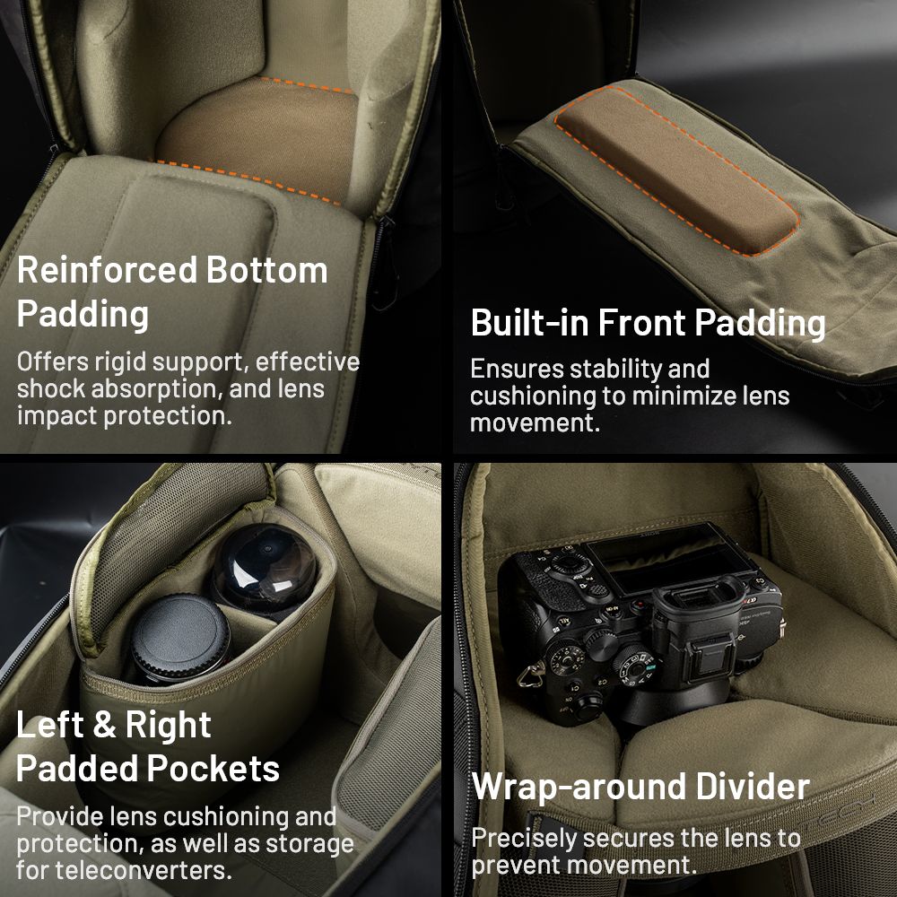 Strong, expandable, self-adjusting dividers offer complete protection for your gear. Internal Velcro closure allows flexible repositioning to accommodate different focal length lenses (accommodates 600-1200mm super telephoto lenses).