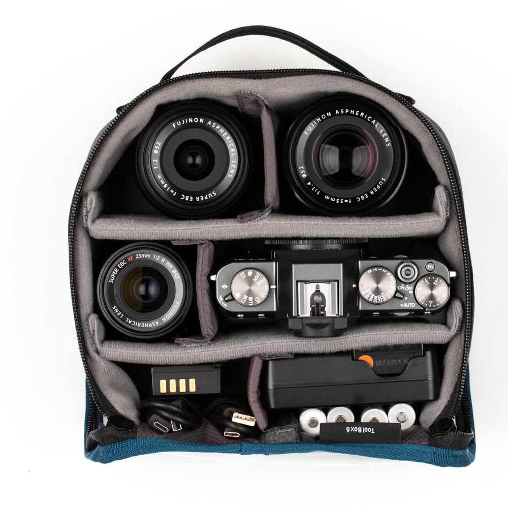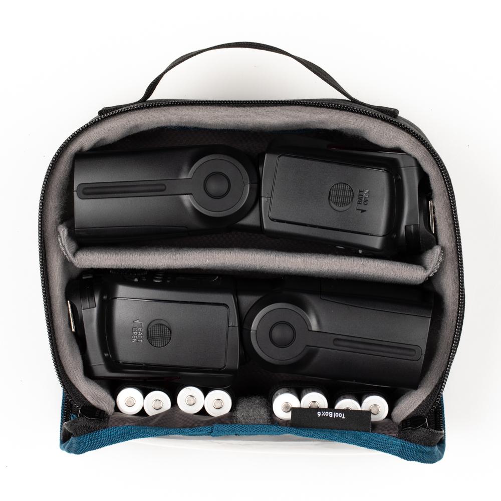 ORGANIZE AND PROTECT SMALLER CAMERAS AND AUDIO GEAR The Tool Box fits GoPro®/Action camera systems, compact mirrorless cameras and lenses, shoe-mount flashes and strobes, microphones and professional audio gear, batteries, cables and accessories. MORE PADDED AND RIGID THAN A CABLE POUCH The Tool Box has a rigid shell and plenty of interior padding to protect equipment and accessories inside any bag. PVC-FREE, REINFORCED WINDOW TPU window with mesh reinforcement ensures contents are visible at a glance. ADJUSTABLE DIVIDERS Movable dividers can be repositioned to any configuration, and their semi-rigid design keeps contents from shifting. DURABLE WEATHERPROOF MATERIALS Exterior of water-repellant 300D herringbone polyester and reliable YKK® zippers. The Tool Box is one of the most versatile storage solutions we've ever made. It's the perfect combination of protection and organization for smaller gear such as GoPro®/Action camera systems, compact mirrorless cameras and lenses, camera strobes, microphones and professional audio gear, batteries, cables and accessories. The walls and dividers are made with a layered combination of protective EVA foam and rigid PE board to keep contents safe inside any bag. Gear is always visible at a quick glance through the reinforced TPU window. Elastic loops keep a tight grip on batteries and cables. SPECIFICATIONS Weight: 0.5lb / 0.23kg Outside Dimensions (in): 7.5W x 6.5H x 3D in. Outside Dimensions (cm): 19W x 17H x 8D cm Inside Dimensions (in): 7W x 6H x 2.75D in. Inside Dimensions (cm): 18W x 15H x 7D cm Capacity: GoPro®/Action camera systems, compact mirrorless cameras and lenses, shoe-mount flashes and strobes, microphones and professional audio gear, batteries, cables and accessories.