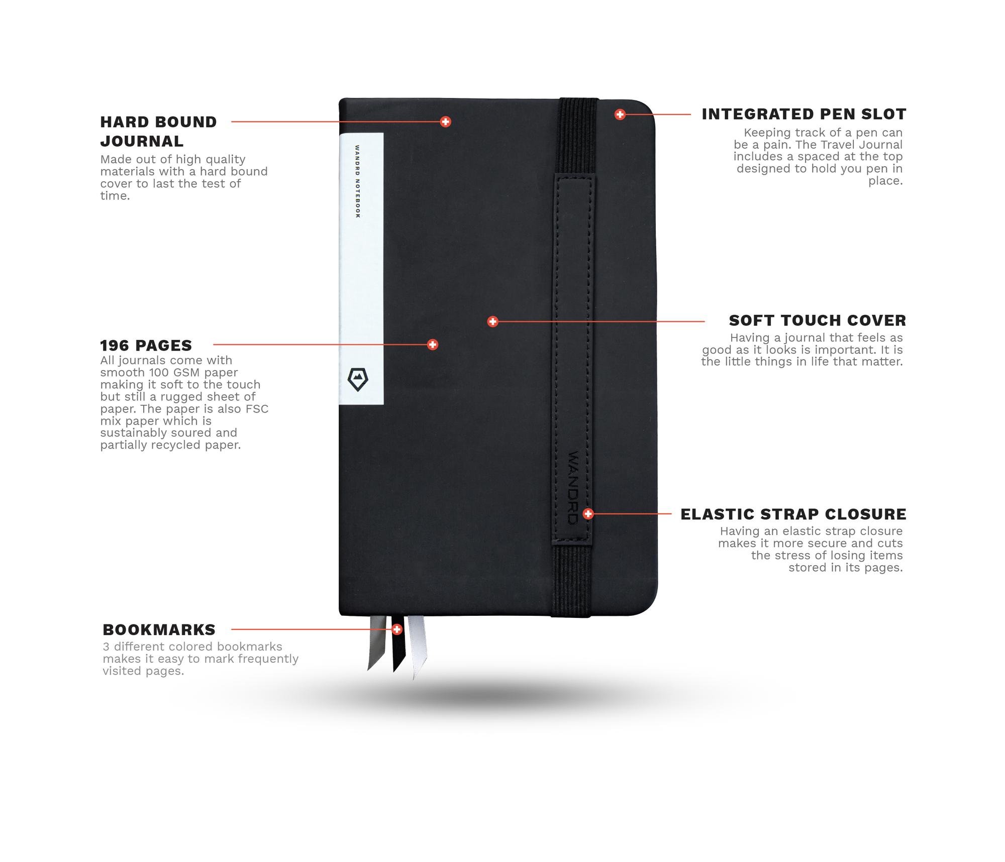 The Wandrd Notebook is a high quality notebook with 196 pages of grid paper. The paper is made from sustainable FSC Mix Paper and has a thickness of 100 gsm. The booklet is bound with a hard cover and features an elastic closing band and an integrated pen holder.